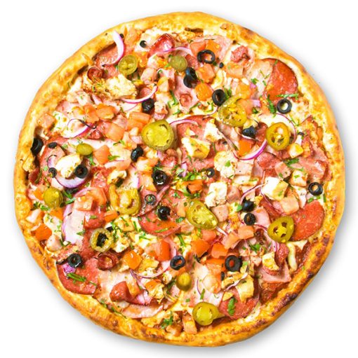 خمیر پیتزا، سوسیس، کالباس، گوشت چرخ کرده، مرغ، زیتون، فلفل، ذرت، سس مخصوص، پنیر پیتزا